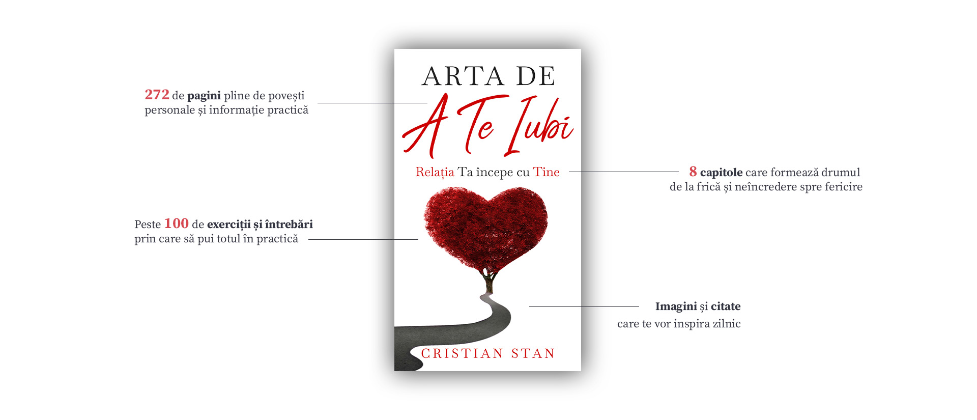 Cartea „Arta De A Te Iubi” vine cu o garanție de 100% banii înapoi + păstrezi CARTEA GRATIS… dar nu ne oprim aici. Îți promitem că atât informația oferită, cât și exercițiile practice te vor învăța să ai atât de multă încredere în tine, încât nu vei mai depinde niciodată de altcineva pentru a simți fericirea. Vei vedea cum toate persoanele toxice nu vor mai putea să profite de tine. N-o să mai permiți nimănui să te trateze altfel decât meriți. Există un motiv foarte bun pentru care această carte a fost numită și „Ghidul Complet Al Iubirii de Sine”! Iată un mesaj de la Cristian: